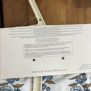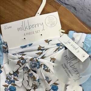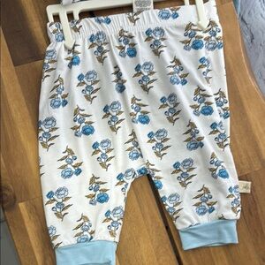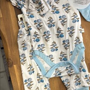 Adorable baby outfit set with floral print. Includes a pants, onesie, headband and socks Soft blue and white colors. Rayon made from Bamboo