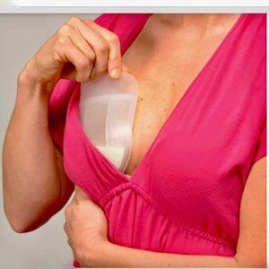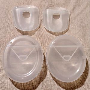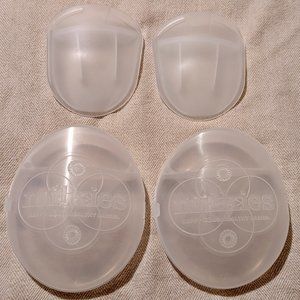 This SET of 2 Milkies Milk-Savers helps you save more breastmilk by catching the letdown milk that often gets wasted (by leaking into your bra). Just place one on your non-nursing breast, inside your bra, while you're nursing. It will collect the milk you leak and when you're done with your nursing session, you can pour the milk into a bottle or bag to save it. Each Milk-Saver holds a little more than 2 ounces of breast milk. It has a removable, protective lid to prevent milk from spilling out. (You can see the lid in the photos; it sort of looks like a little table). Each Milk-Saver also comes with a hard plastic case you can use to store it. The Milk-Savers themselves are also made of plastic; a thick, pliable plastic that contains no BPA or phthalates. NOTE: Though you would only use one Milk-Saver at a time, this set includes 2 so that you always have one that's clean and dry. I have sterilized these myself, and they can be sterilized again, easily, by boiling -- or cleaned in the top rack of a dishwasher. They come in one size only, which should fit most breast/nipple sizes. The diameter for the circular nipple opening is one inch. The Milk-Saver itself measures 9.49 inches long x 6.1 inches wide x 2.8 inches thick. (It covers the entire breast; please see photos for details.) Each one retails for $27.95 when new, so this price for 2 is a good one! Will ship with original box and instructions -- see photos.