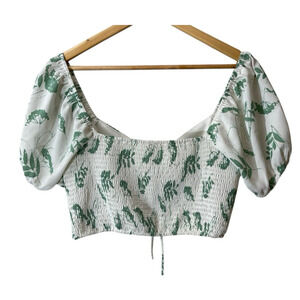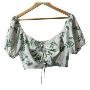Milkmaid Boho Puff Sleeve Crop Blouse Leaf Print Ruched Tie Front Cottagecore