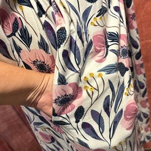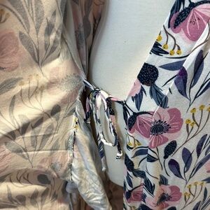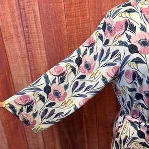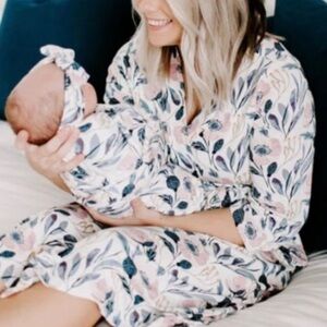 This beautiful cross-over robe is the perfect addition to every woman's wardrobe. It features 3/4 length sleeves, pockets, a sash secure hole (for the sash to go through) so there's no unexpected peekaboos, and buttery soft jersey knit fabric. Approximately 44” long from shoulder. Comes with the perfect sash to keep everything together. Once you've worn it, you will never want to wear anything else. EUC