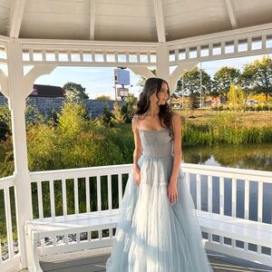 This stunning Milla formal gown features a romantic corset-style bodice with delicate lace-up detailing and adjustable tie straps. The layered blue tulle skirt flows beautifully, creating an elegant and ethereal silhouette perfect for formal events, weddings, or prom.