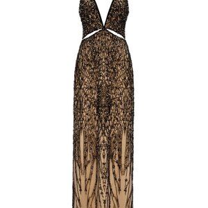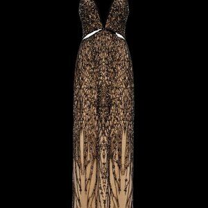 This striking beige maxi dress on spaghetti straps with exquisite black sequined ornament is a gala-worthy option capable of overshadowing paparazzi flashes. The beige color reminds of a skin that serves as a canvas for a sparkling black ornament. A deep V-neckline is adorned with side cuts under the decollete that continue on the back imitating the co-ord set. The maxi skirt has a back slit.