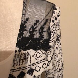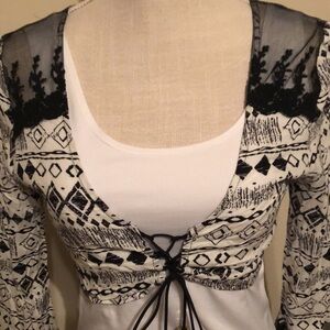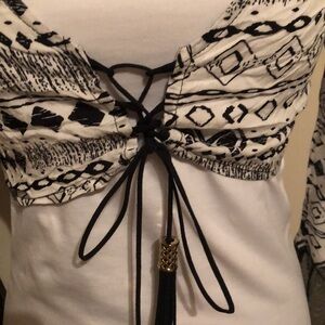 Millau crop top with lace up bodice closure. Fabric is black and white Aztec design. Black lace at shoulder. Long sleeves with wide lace at bottom. Adorable . Ex Sm. NWT. White tank not included