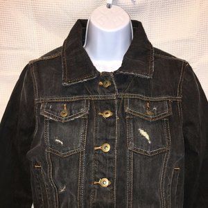 Millau womans small dark wash denim cropped jacket with distressing.
