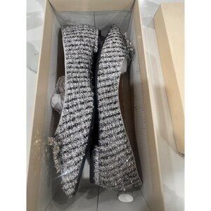 Elegant pointed-toe flats designed for style and comfort. Crafted from silver tweed with an embellished bow, they offer a chic and polished look.