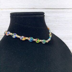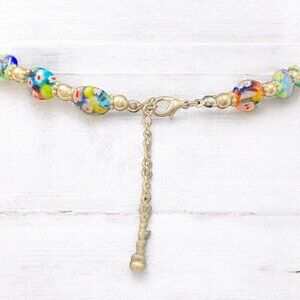 Millefiori Art Glass Necklace Multicolor Floral Design Gold Faux Pearl 15.5"L