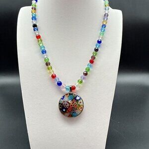 Great Condition. Handmade necklace with a millefiori glass pendant. Measures approx. 17" long. The pendant measures approx. 1.25" across.