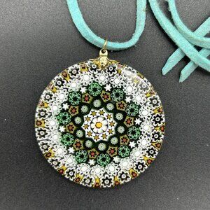Millefiori Glass Pendant on Teal Cord Necklace 26" Long 1.5" Across White Green