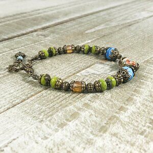 Adorable bronze bracelet with a unique 12mm hearts shaped millefiori glass cabochon with bright colors, premium Czech glass beads in rustic blue, green apple picasso and orange. It has a lobster claw clasp and extender so you can adjust the length to your wrist. 6.75" - 8.5".