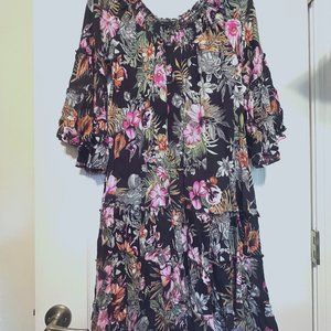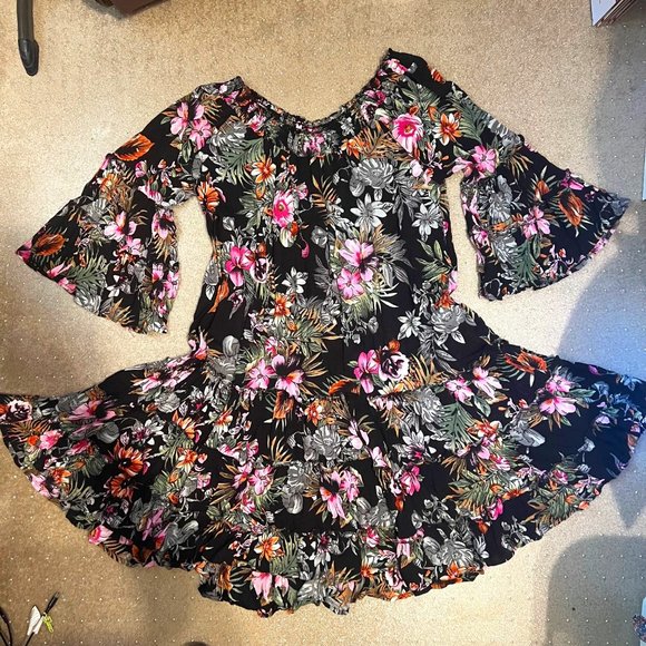 Millenium Black & Floral 3/4 Sleeve-Flowy-Off Shoulder or On-Mini-Size Medium