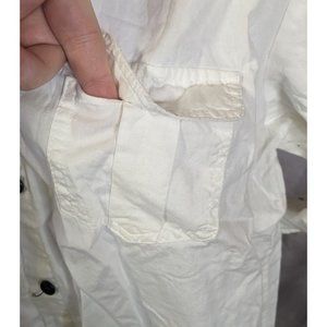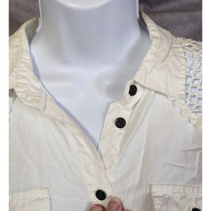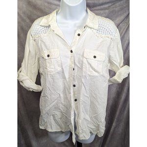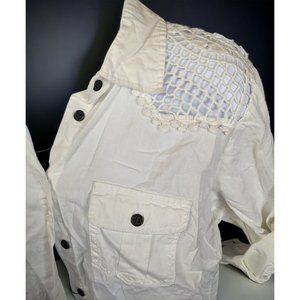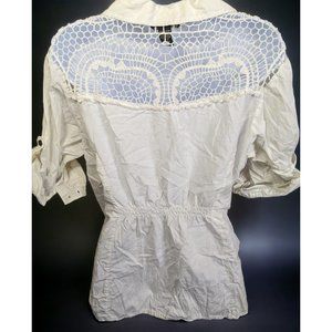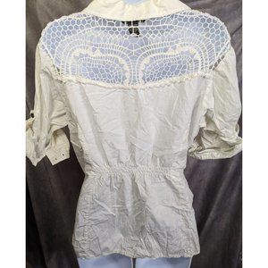 Fun Y2K style lace shoulder button up by Millenium. It's made of a white 100% cotton fabric. It buttons down the front, has fold over collar, and two working button pockets on the chest. The buttons are black with a subtle rainbow oil slick detail in the middle. The shoulders have cutouts that have been filled with beautiful lace. It has elbow length sleeves that roll up, and are secured with a strap. There are also buttons on the sleeve hems. The middle of the back has some ruching with elastic, giving it a tailored fit around the middle. Great Y2K vibes!