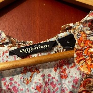 Millennium maxi dress Orange Floral Sleeveless Tassel Tiered Sz L Maxi Dress
