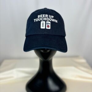 Grab this great condition, Miller Lite Beer Up Touchdown hat. Featuring a fun design that combines your love for football and your favorite beer. Whether you’re tailgating, hitting the bar, or just relaxing at home, this hat is the perfect accessory to show off your personality.