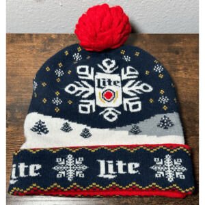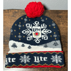 Miller Lite Adult Blue Christmas Holiday Beanie Winter Hat w/ Red POM.
