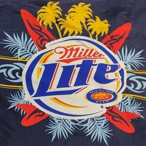 Miller Lite mens short sleeved button down shirt. The stitching under the left side arm pit is coming loose. There is a slit on the right side front and a blue bleed spot on the left front side