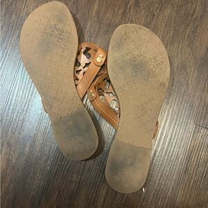 Vintage Vachetta Leather Miller Sandals. They have been worn plenty, but they have a lot of life left. The toe piece and bottoms of shoes are still in good condition.
