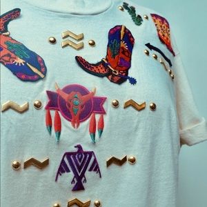 Miller Stockman for Western Living T-Shirt. Size: Medium. Color: Ivory t-shirt with added patchwork detail.