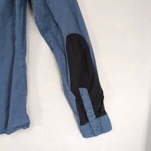 * Features: Navy blue shirt with black stretch panel on sleeve, chest zip pocket, button front closure with placket cover, collared neckline, long sleeves with button cuffs, cotton-hemp face