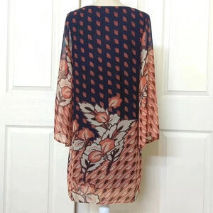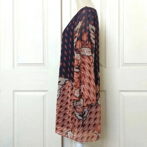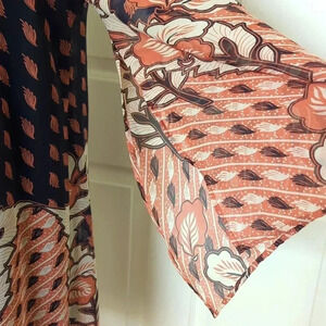 Millibon USA Navy/burnt orange and ivory printed dress. Fully lined. Split bell-like sleeves. Sheer arms. Polyester