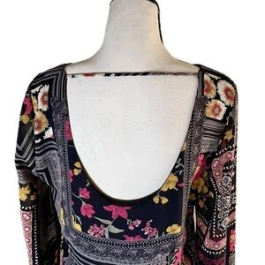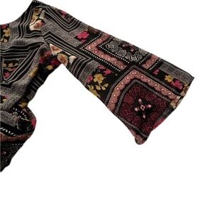 Flowy all over patchwork and floral pattern fully lined with sheer bell sleeves.