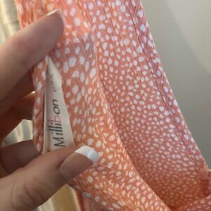 Stylish Millibon dress with coral dot pattern. Sleeveless and elegant design.