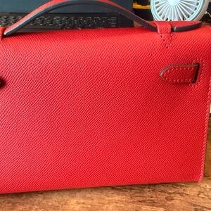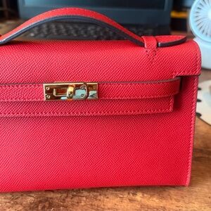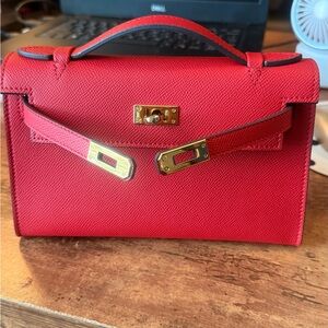 Stylish red handbag featuring gold accents. Perfect for any occasion.