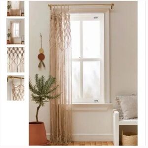 Macrame fringed window panel, capturing a classic bohemian look that trims your space with free-spirited energy. Elaborate knotting is topped with loops along upper edge for easy hanging.