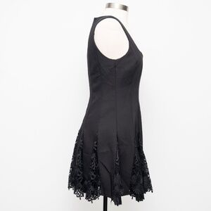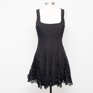 Striking in black, the MILLY Ariel Cady Floral Cutout Mini Dress features a structured fit-and-flare silhouette with a square neckline, fitted bodice, and sculptural godet-style inserts that create dramatic movement. The standout detail is the intricate floral appliqué lace that begins at the lower half of the dress and fans outward in dimensional panels, giving the skirt a soft, accordion-like shape with eye-catching texture. Crafted from smooth cady fabric with a hidden back zip, this sleeveless mini is a bold yet elegant choice for cocktail parties, rooftop dinners, or summer weddings.