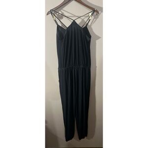 The Milly black jumpsuit features a chic criss-cross strap detail at the back, adding a touch of elegance to its classic design. Crafted from a soft, drapey fabric, it offers a relaxed fit with a blouson waistline and flowing leg silhouette. This versatile piece is perfect for both casual daytime outings and evening events. Pit to pit 16” length 53”