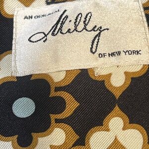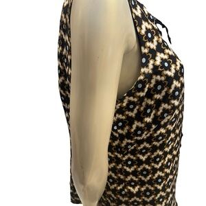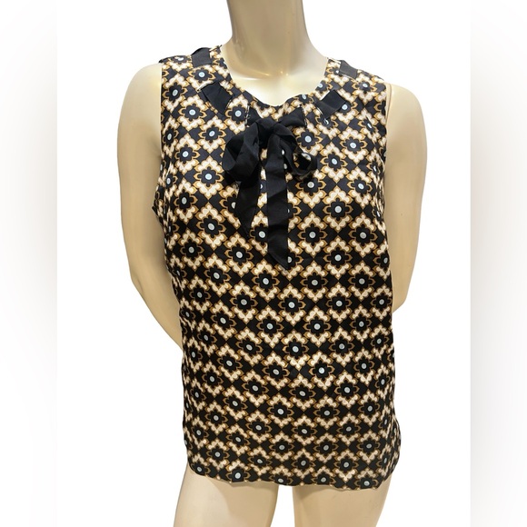 Milly sleeveless blouse with a bold black and gold geometric pattern. Features a stylish bow detail at neckline
