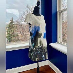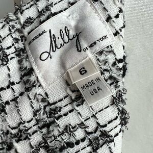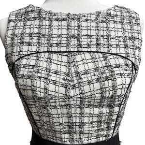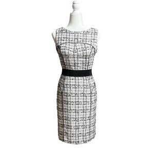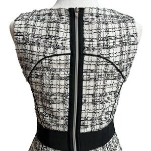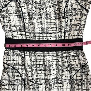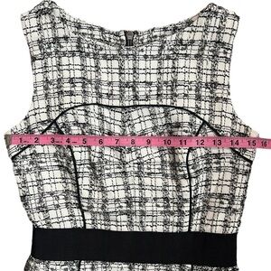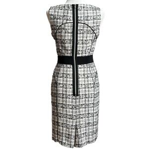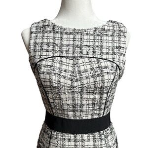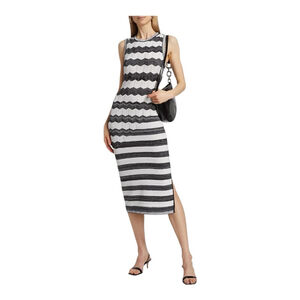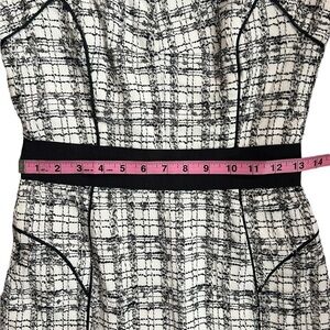 This sophisticated Milly dress showcases a sleek sheath silhouette in a striking black and white pattern. The sleeveless design features a chic halter neckline, perfect for work or cocktail occasions. A solid black band at the waist adds a flattering touch, while the midi length offers a polished finish.