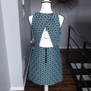 Stylish mini dress by Milly. Features a bold blue and black geometric pattern. Sleeveless design with a modern look.