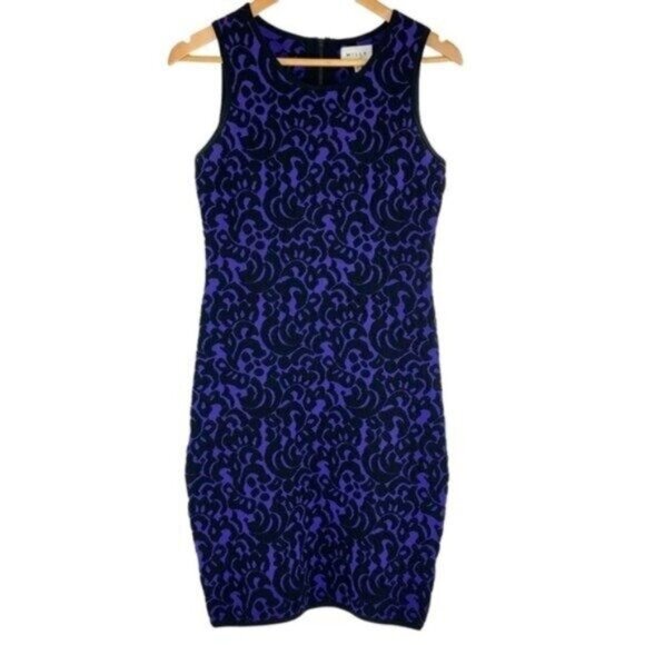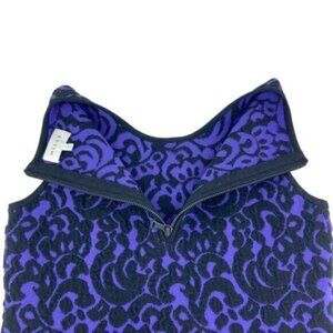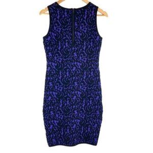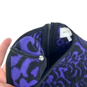 Milly Bodycon Sheath Dress in Purple and Black Brocade Jaquard. Size small. Sleeveless. Crewneck. Back zipper closure. Excellent used condition.