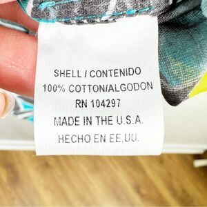 A floral geometric pattern in turquoise, white yellow and black adorns a lightweight semi-sheet 100% cotton fabric. Short gathered puff sleeves, gathered scoop neck and a boho attached tie with wood beads. Just in time for that tropical escape.