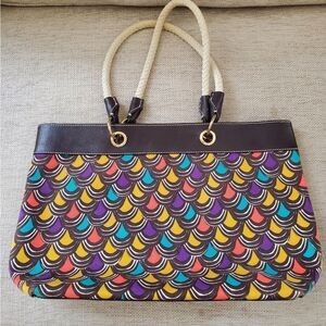 Whether you're heading to work, running errands, or going out for a night on the town, this tote is versatile enough to suit any occasion. It features inner pockets to help you stay organized, and the fabric lining is a pretty shade of pink that complements the colorful exterior. With its designer name tag and Milly product line, this tote is a must-have for any fashion-forward woman.
