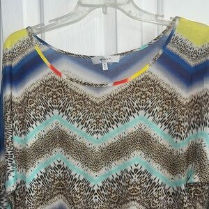Chic blouse with bold chevron design. Features blue and yellow accents wth leopard print.