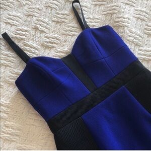 Cobalt blue with black perforated trim. Fully lined. Fitted silhouette.