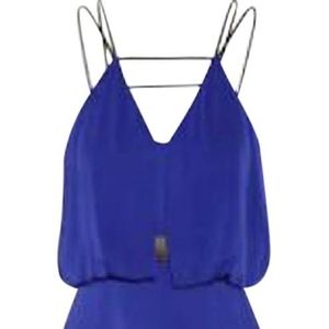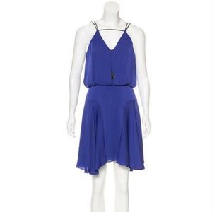 Cobalt and black Milly sleeveless mini dress. V neck. Narrow lambskin straps. Draping at bust. And in back. Fluted hem. Black zipper black close. Size 6. Amazing summer/vacation dress. 92% silk. 8% Spandex. 100% Lambskin detailing.