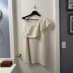 Chic off-shoulder blouse with ruffle detail. Soft cream color. Perfect for stylish outings.