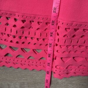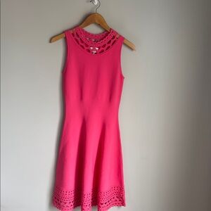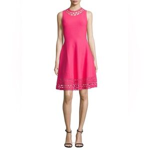 Charming MILLY fit-and-flare swing dress with cutout details. Scalloped round neckline. Cutout scalloped details at neck and hemline. Fitted bodice. Sleeveless. Stretchy Ottoman ribbed knit. Pullover style. . Viscose/elite. Dry clean