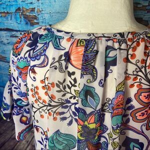 Milly for Designnation. Peasant style top, white with a floral print in blue and orange on a white base. Short sleeve and a drawstring neck. Good used condition.