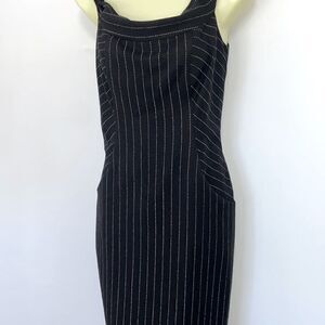 BY MILLY OF NEW YORK HERE IS A GORGEOUS SHEATH STYLE DRESS. IT IS DONE IN VISCOSE/WOOL AND CASHMERE. FULLY LINED,THIS DRESS FEATURES A COWL NECK AND SIDE POCKETS. THE PRINT IS BLACK WITH GOLD TONE DOTS ADORNING IS. TWO HIP POCKETS AND A TEN INCH KICK PLEAT COMPLETE THE LOOK. BACK ZIP.NWOT~ SIZE 6, PLEASE NOTE THE MEASUREMENTS