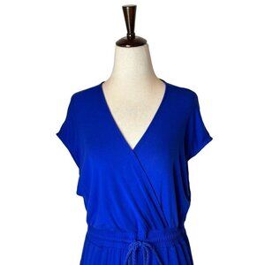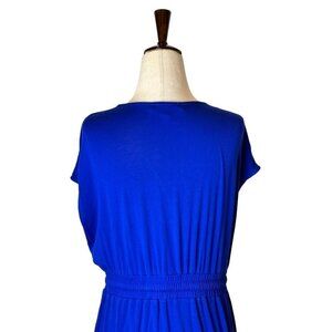 This dress from Milly For Design Nation is in excellent condition. It is a solid royal blue color in a jersey knit fabric. It features; Surplice, V-neckline, Short sleeves, Drawstring Tie waist, Side pockets, Maxi length with a pullover style and is crafted from a rayon and spandex blend.