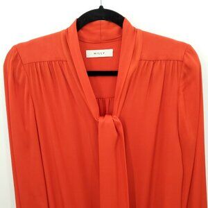 Milly Gathered Tie Neck Silky Long Sleeve Blouse L Red