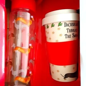 Milly Green Dachshund Dog Christmas Drinks Bottle And Travel Mug Set New