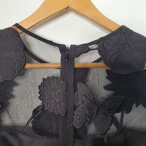 Crafted of sheer black organza embroidered with delicate flowers and butterflies, the Milly Rosie Dress features a removable belt to define the waist and a feminine peplum hem. Designed with a jewel neckline, short sleeves, and concealed back-zip closure for an elegant, structured fit. Perfect for weddings, cocktail events, and formal occasions and events.