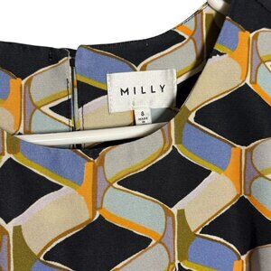 This Milly sheath dress features a bold geometric print in vibrant tones, offering a polished yet standout choice for professional or social settings.