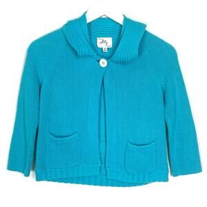 Open front sweater with tie at neckline and white button detail. Cropped length with three quarter sleeves.