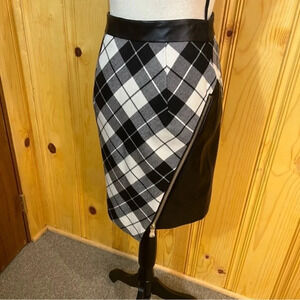 NWOT very cute black and white plaid mini skirt with a black leather side panel that has two gold working zippers. There is also a side gold zipper closure. Waistband is black leather. Fully lined. Zipper pulls still have plastic on them. In new condition. Approximate measurements laying flat: waist 27” and length 23”.