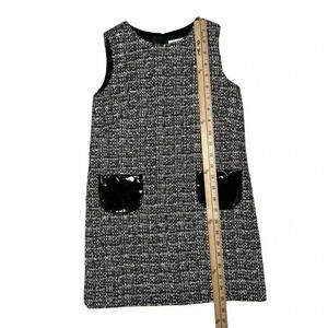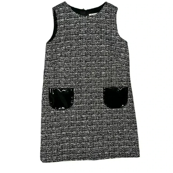 Chic tweed dress with black patent pockets. Sleeveless design. Perfect for stylish outings.